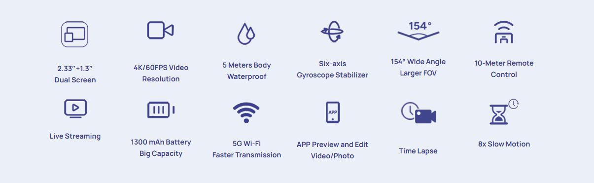 You can equip it with drones to record high-altitude scenes. It can also snorkel freely in 5 meters of deep water without any waterproof equipment. Don’t worry, it’s 5 m body waterproof.